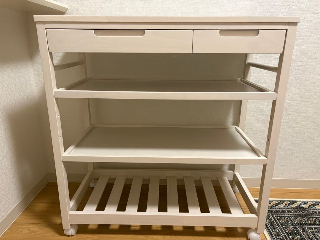 ナチュラルな木製の3段キッチンワゴン、折りたたみ可能でキャスター付き。- タイプ: キッチンワゴン- 素材: 木製- 色: ナチュラル- 棚数: 3段- キャスター: あり- 折りたたみ機能: ありキャスターのロックも正常に作動します。2024年8月に購入しましたが引越し先の家では置くスペースが無いので出品します。4ヶ月程しか使用してないので少し傷はありますが美品です。※自宅で素人の組立ですので何の支障もなく使用してましたがご留意ください。商品詳細・寸法などは写真をご参照ください。自身の購入ページより引用してます。大型商品なので梱包発送たのメル便での発送となります。あくまでUSED自宅保管の為、神経質な方、完璧を求める方の購入はご遠慮くださいm(_ _)m
