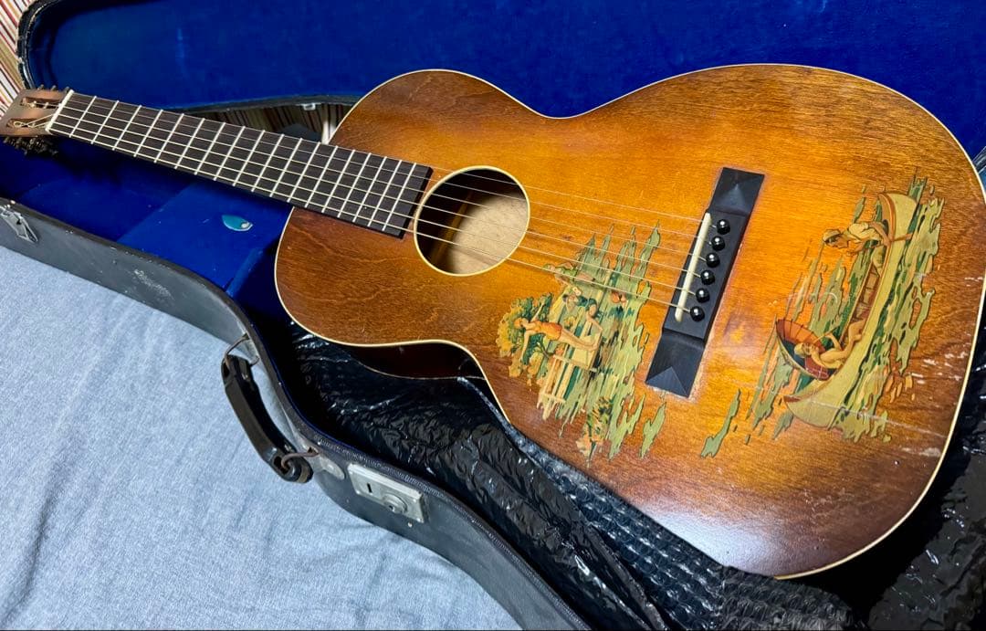 かなり古いので、一応ジャンク扱いですのでご了承ください。普通に弾けます。傷、汚れトップの灼け、ヒビなど。音質はサスティーンがあり、12フレットジョイント特有の深い低音。Martinの00-21に近いサイズです。ケースは当時のボロいハードケース付。